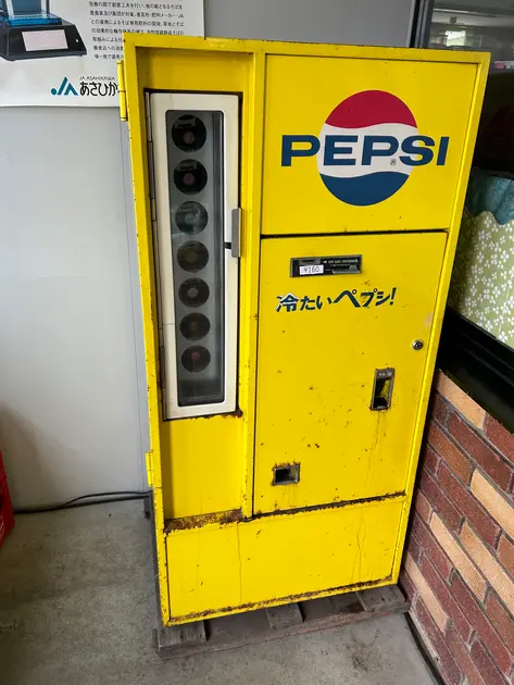このレトロ自販機は、旭川から車で約40分、「北海道のまん中・旭川空港」から車で約20分、美瑛町の「花輪食品店」自動販売機コーナーにあります。