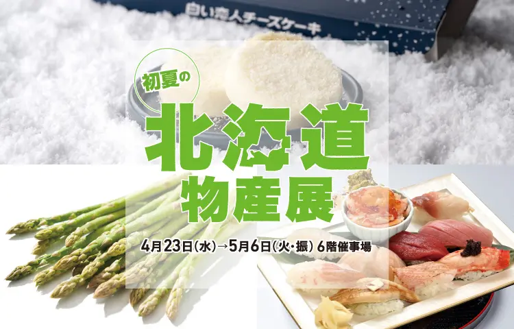 特大ホタテやエビがぎっしりの海鮮弁当、春のアスパラを使ったメニュー、人気のカレーパン、春を感じるスイーツなど、旬の北海道グルメを一気に堪能できます。