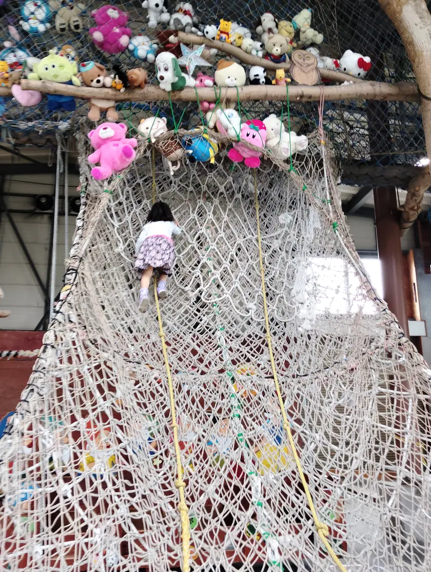 特に目を引くのが、高さ5mはあろうかというネット遊具。最初は「ちょっと怖いかも…?」と感じる保護者も多いかもしれませんが、実際に遊んでいる子どもたちは笑顔いっぱい。少し難しい遊具こそ、達成感や自信につながるチャンスです。施設内には「がんばれ!がんばれ!保護者の方はお子さんを見守って下さいね。」というユーモアのある張り紙も。子どもたちのチャレンジを温かく見守る姿勢が大切ですね。
