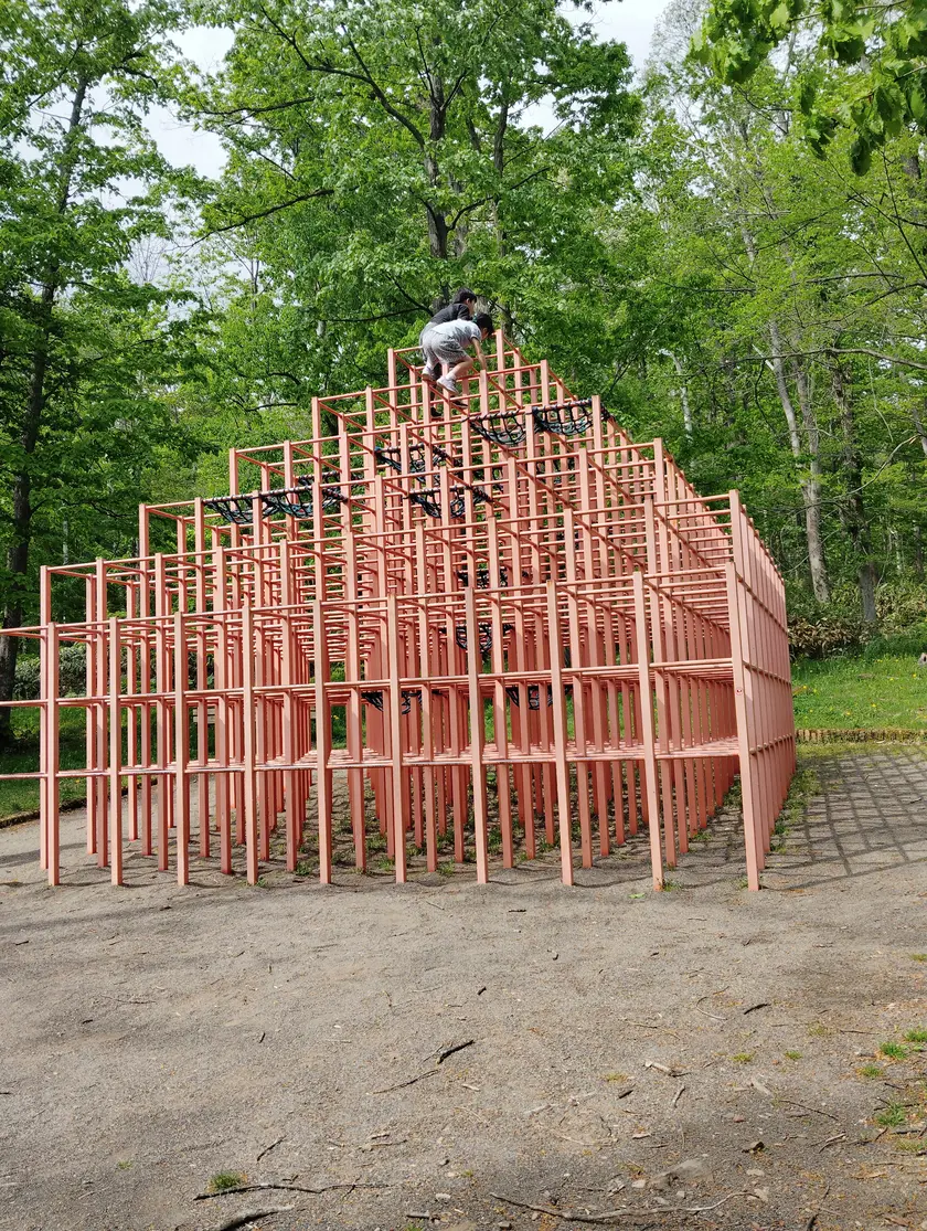 奥へ進むと見えてくるのが「ヤッホーの森」。ここは無料で楽しめる大型遊具エリアで、ジャングルジムやターザンロープなど、体をたくさん動かして遊べる仕掛けがいっぱいです。