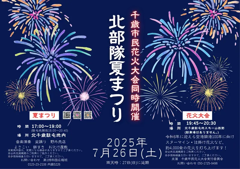 北千歳駐屯地を会場に、音楽演奏や盆踊り、20軒の売店出店などが予定されています。フィナーレには、北千歳駐屯地の通称スキー山から約4,000発の花火が打ち上がります。