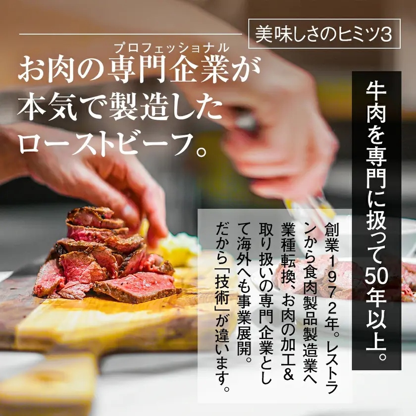 移住を考えている人や、子育てファミリーが熱い視線を注ぐ石狩市には、“安心・安全・おいしい”が三拍子そろったふるさと納税返礼品があります。それが「道産牛のローストビーフ」です。こちらの商品を手掛けるホクビーは、1972年より続く食肉加工のプロ。石狩市に本社と工場を置き、その高い技術力で数々の人気商品を生み出してきました。