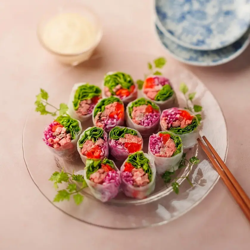 「ローストビーフとたっぷりの野菜をライスペーパーで巻きました。野菜がたくさん食べられて見た目もおしゃれ♪ おもてなしにもぴったりな一品です。ソースはお子さんも食べやすいようにマヨネーズベースにしています。野菜は、お好きなものでOKです」