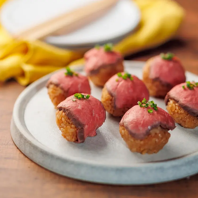 「ニンニク香るしっかり味のガーリックライスとローストビーフが相性抜群の手まりおにぎり。小さめに握っているのでお子さんも食べやすいサイズ感です。ガーリックライスは調味料を入れて炊飯器で炊くだけなので簡単ですよ♪」