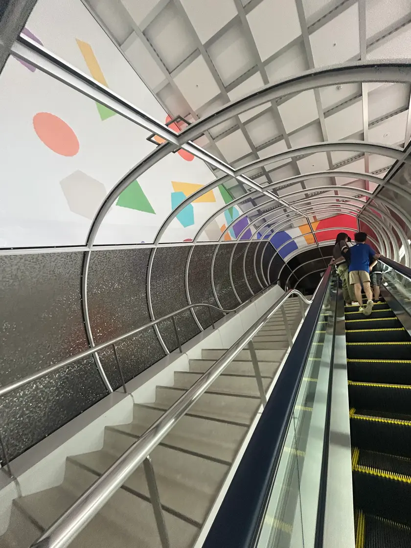 トンネルのようなエスカレーターをくぐり、いよいよ見学スタート!この日は平日の午前中でしたが、夏休み期間ということもあり多くの来館客で賑わっていました。チケットは事前にオンラインで購入が可能なので、待ち時間短縮のためには事前購入がおすすめです。