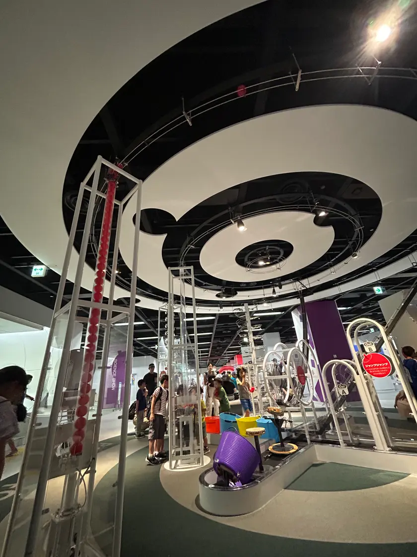 ニュートンのりんごに見立てたボールをレールに転がして物体の運動について学べる「パワーフォレスト」は多くの子どもで大賑わい。ハンドルや空気入れを使ってボールをレールに運び、そのボールがどのように動くかを観察することで物体運動の法則について知ることができます。執筆者の息子はここから離れず、1時間近く夢中で遊んでいました…!保護者が見守りながら休憩できるベンチが周りに設置されているので、とても助かりました…(笑)。