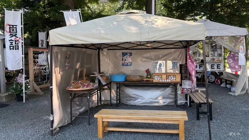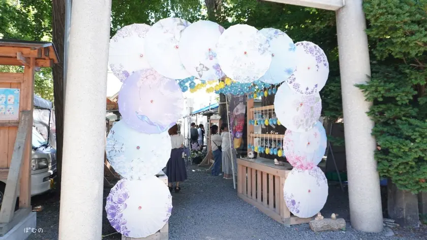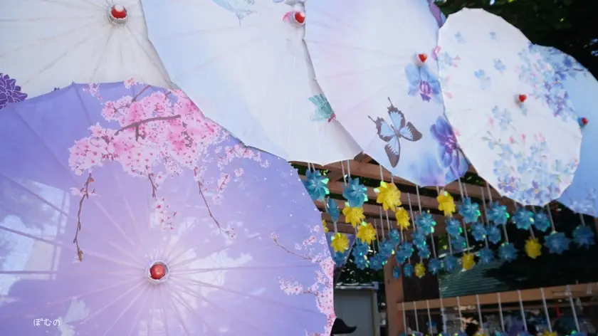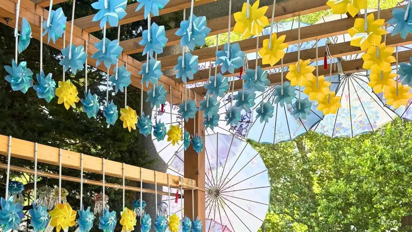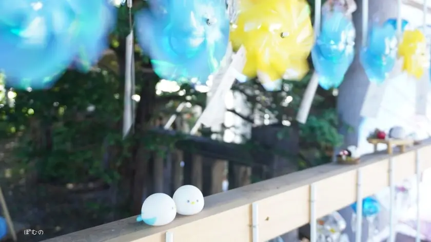 境内に並ぶカラフルな風車は、クラゲの風鈴とともに、爽やかな音と彩りを添えます。風車は色が季節によって変わるので、何度訪れても新鮮な気持ちで楽しめます。