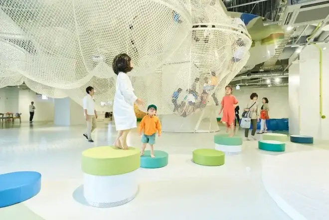 子どもたちに人気が高いのは、「プレイグラウンド」にある巨大ネット遊具「雲」。凸凹したネットの上を自由に歩き回ることができ、天井の鏡に映る様子はまるで雲の上にいるみたい。山・丘・池をモチーフにした複合遊具は、登ったり降りたりする子どもの動きと連動して、風が吹いたり光を放ったり。楽しい仕掛けがいっぱいです。