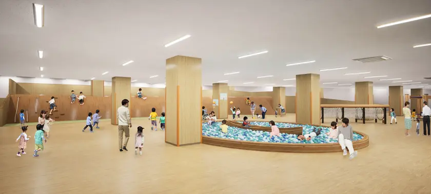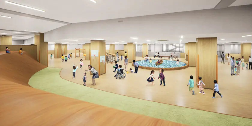 施設内には全身を使って遊べる「プレイグラウンド」に加え、積み木やおままごとをしたり、絵本を読んだりと親子でゆったり遊べる「まる広場」、休憩できる「テラス」などがあり、子どもの成長段階に合わせてさまざまな遊びが楽しめます。