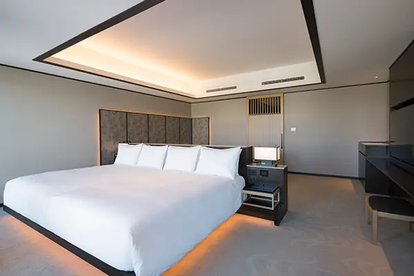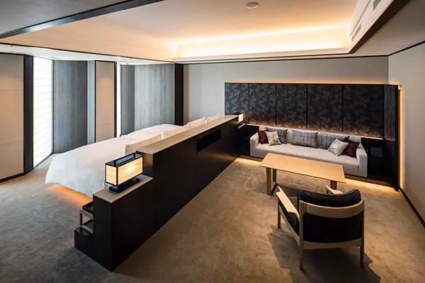 日本風の露地を思わせるエントランスを抜けると、63㎡の開放的な空間が広がるジュニアスイート。リビングとベッドルームがひと続きでありながら、それぞれの独立性を保ち、心からくつろげる時間を演出します。