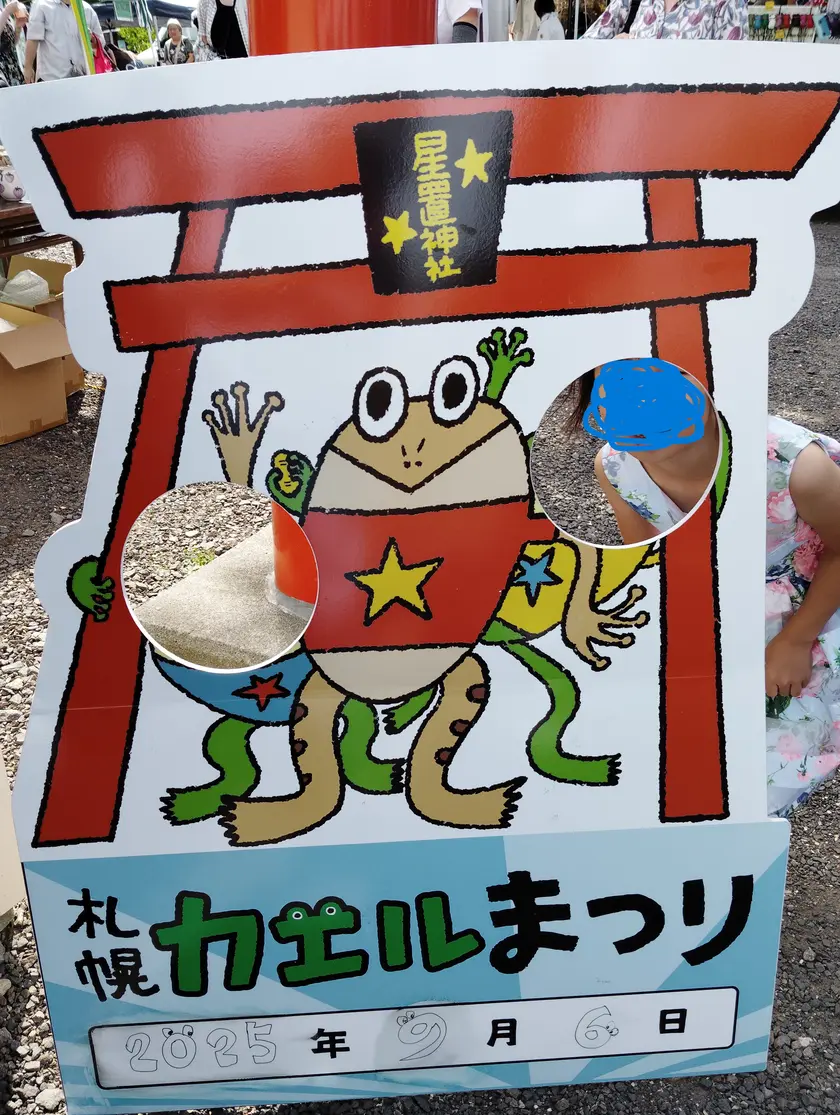 鳥居付近には「札幌カエルまつり」の顔ハメ看板があり、記念撮影スポットとして大人気でした。