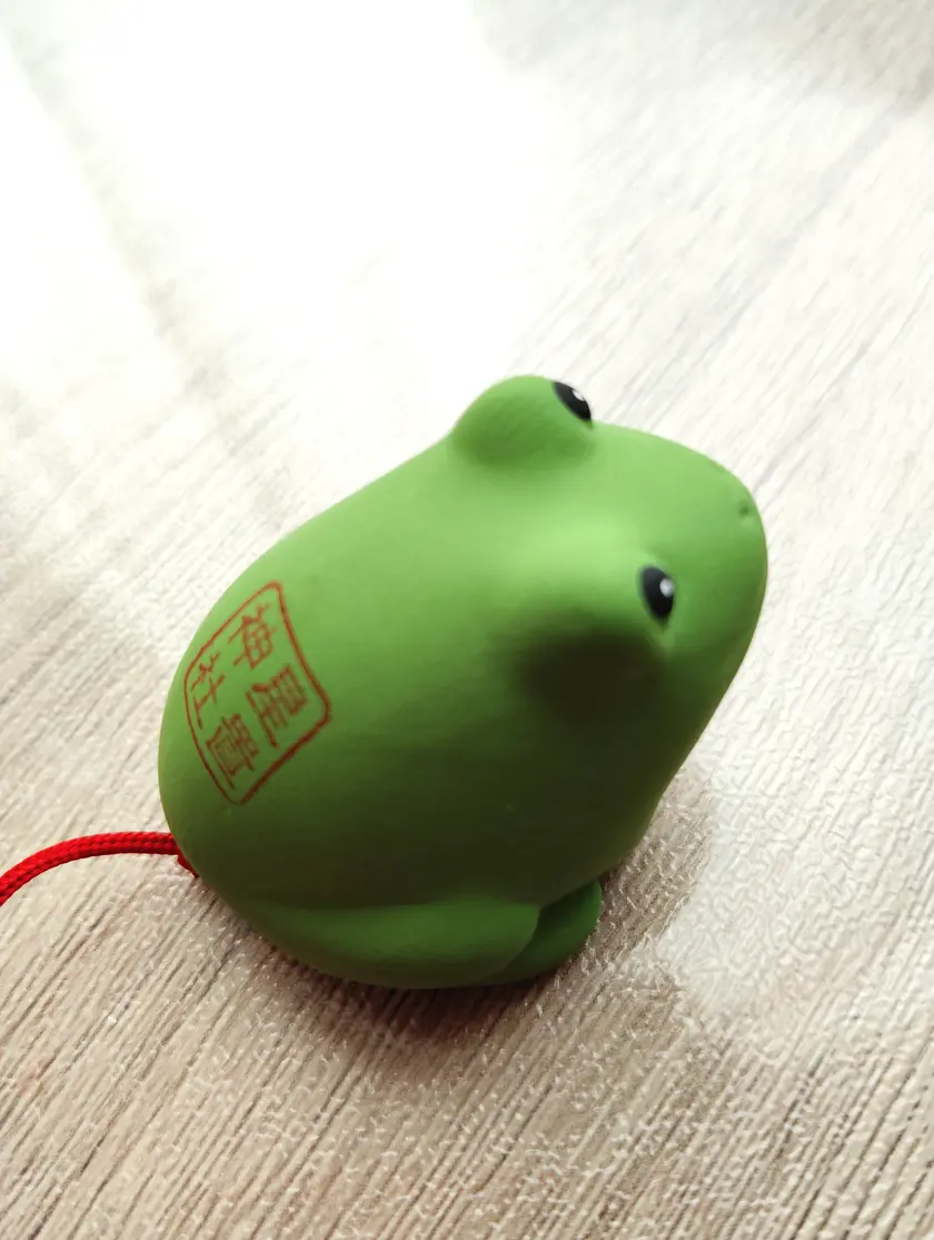小さな陶器のカエルの中におみくじが入っていて、引いた後はそのまま開運グッズとして飾れる可愛らしいおみくじです。持ち帰った陶器の小さなカエルは、家に置くだけで福を呼んでくれそうな存在感がありました。