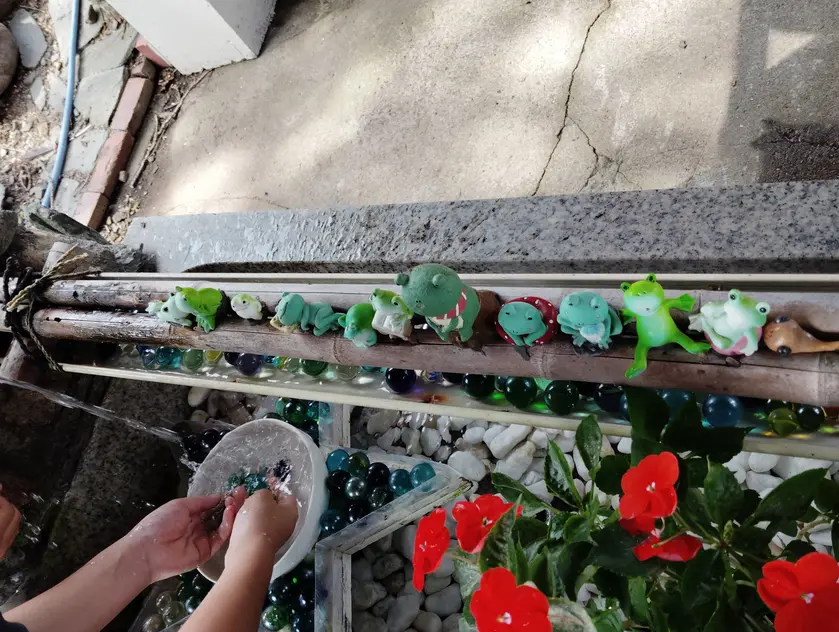 境内では花手水がカエル仕様にデコレーションされ、ビー玉の輝きと小さなカエルの人形が涼しげ。
