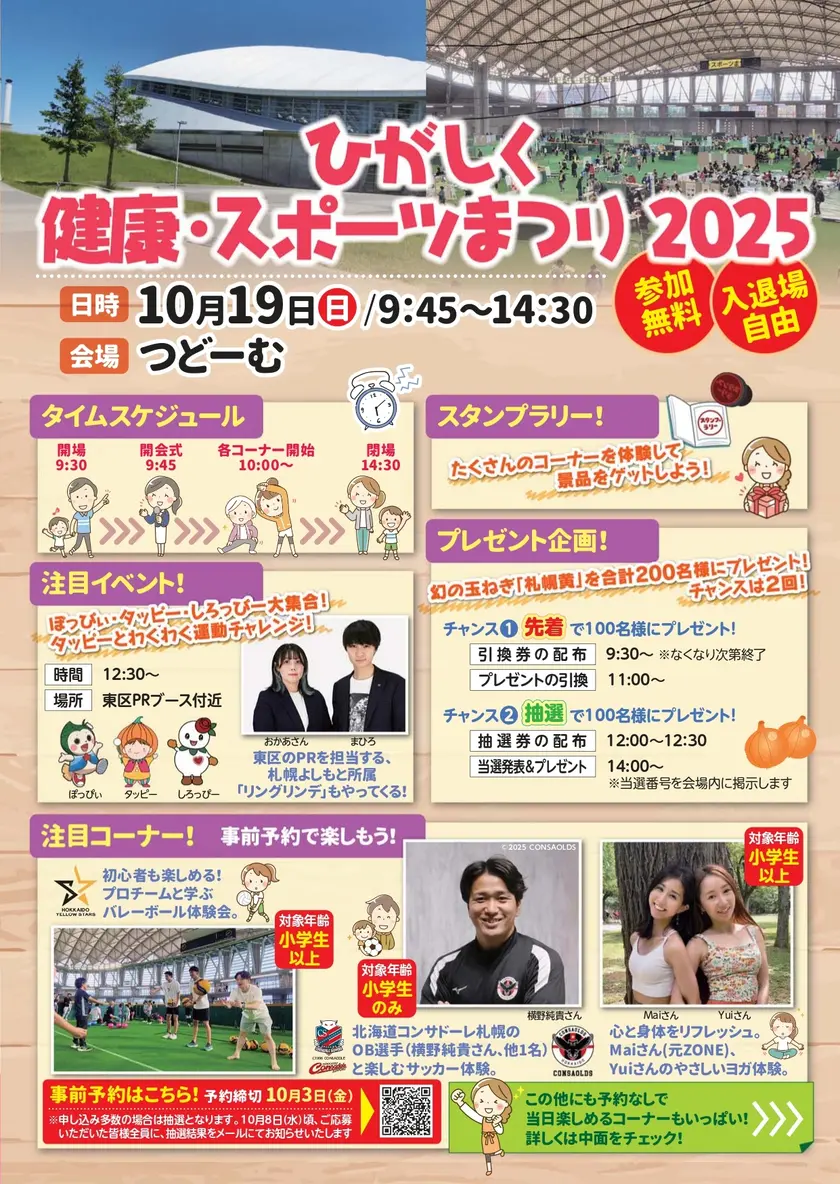 誰もが気軽に楽しめる「ひがしく健康・スポーツまつり」が今年も開催!札幌市東区が主催する、健康・スポーツ・食をテーマにした体験型イベントで、健康的な食習慣や運動習慣を身につけるきっかけ作りを目的として、ウォーキング、スポーツ体験、健康チェック、食育ブースなど、幅広い世代が楽しみながら参加できる企画が豊富に用意されています。体を動かす楽しさと、自分の体と向き合う大切さを一日で体験できるほか、会場にはキッチンカーや飲食ブースも登場します!