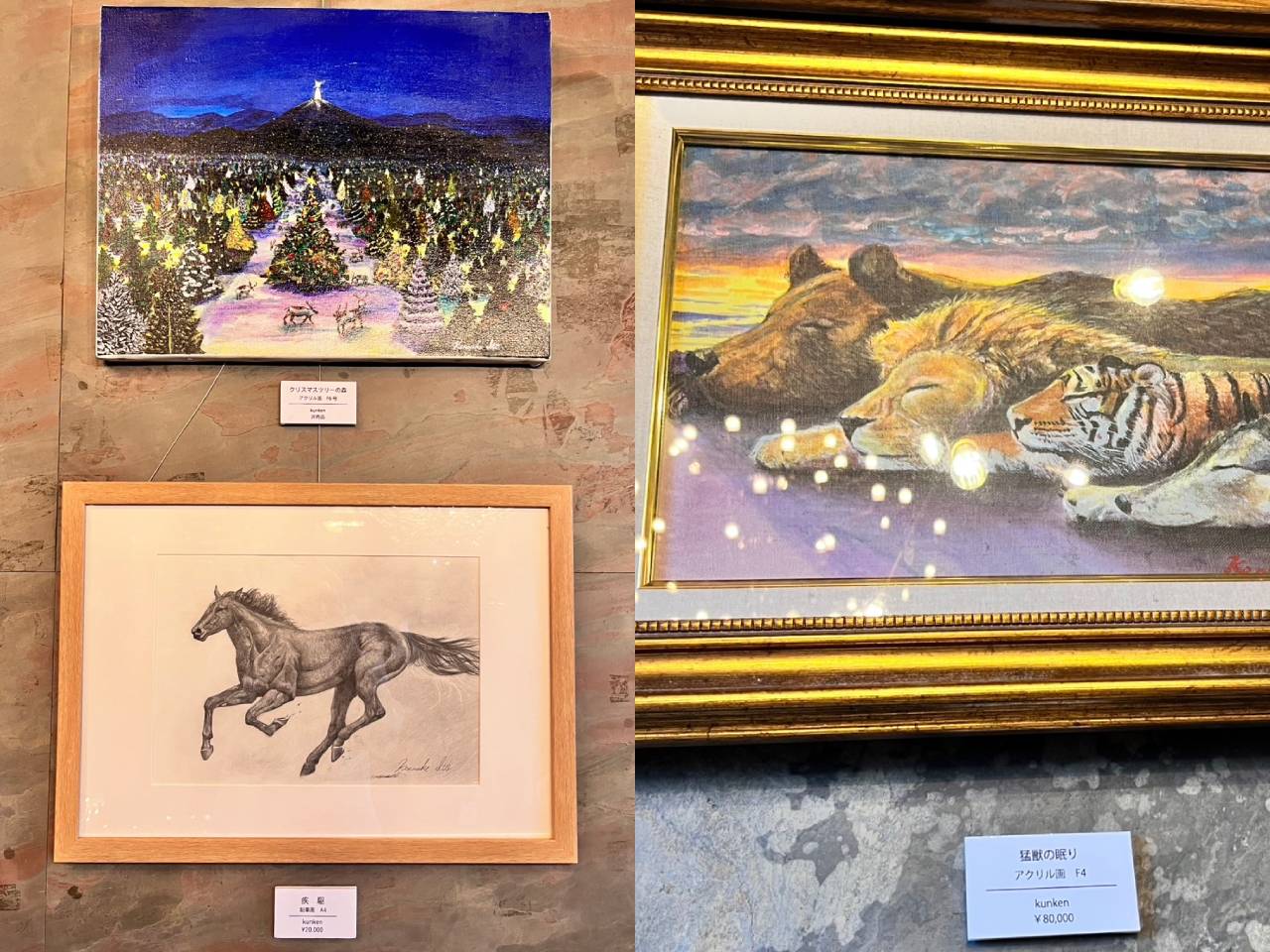 疾走感のある馬や、穏やかで温かみのある猛獣の寝顔など、モチーフは様々。画材はアクリル、水彩、鉛筆などで、作品によって絵のタッチも異なるようです。どれも丁寧に描き込まれており、作家さんの人柄が感じられます。