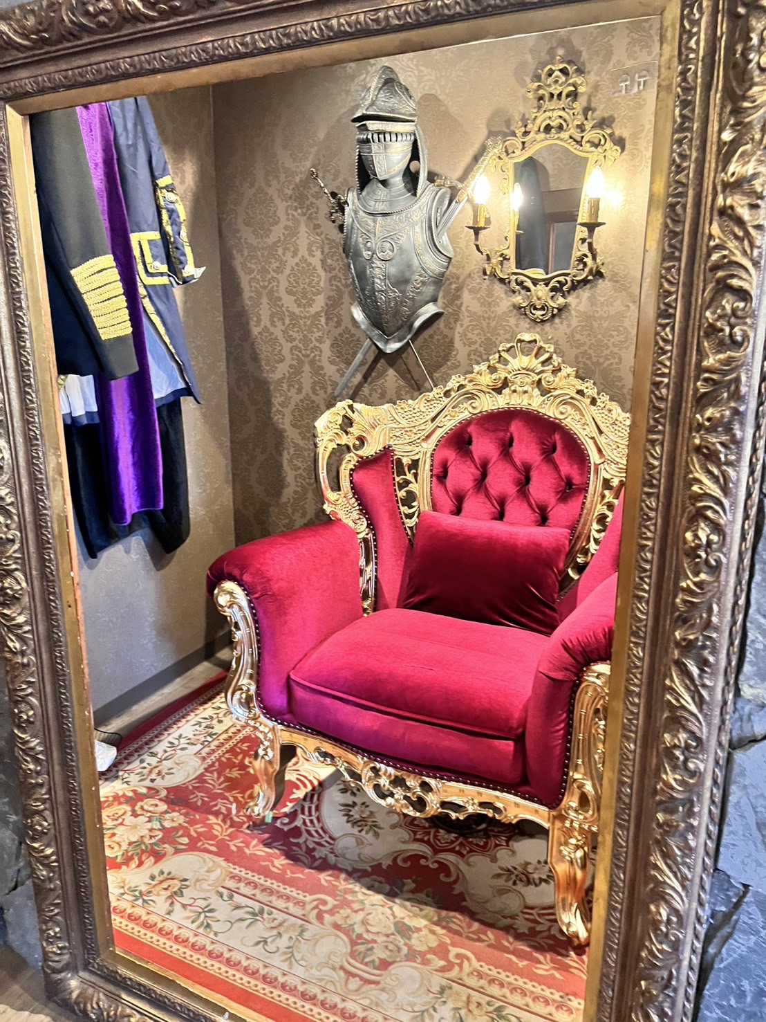 入り口左手の壁奥には豪華なソファチェアや甲冑、鏡が配置されています。椅子に座ったりお気に入りのぬいぐるみを乗せてみたりなど、自由な構図で撮影可能です◎