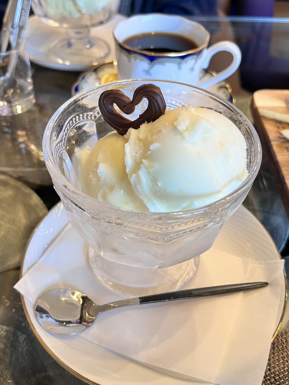 アイスクリームのように濃厚な口当たりで、爽やかな柚子の香りが感じられる一品。ハート形のチョコレートが刺さっています。