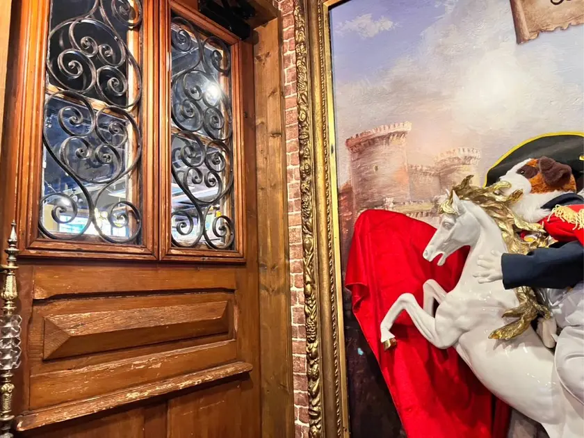 右手入り口から入って階段を上ると、大きな絵画をバックにしたナポレオン風のオブジェが。よく見てみると、ナポレオンに見える部分は犬のぬいぐるみです。