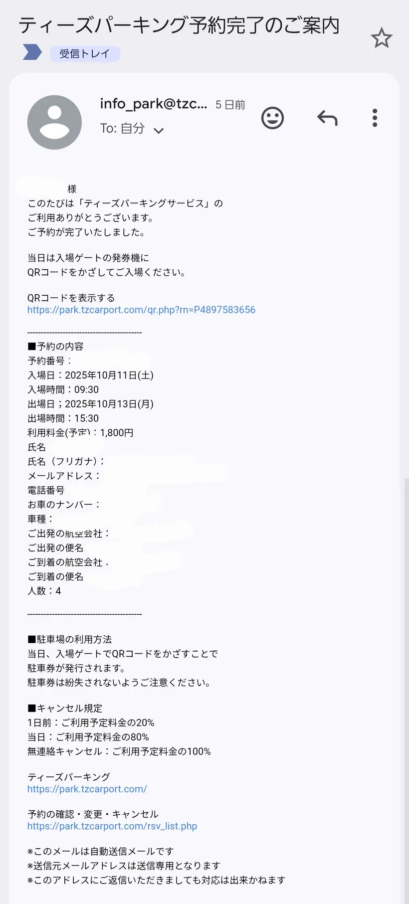 以下のような予約完了メールが届きました。