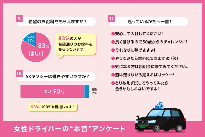 SKタクシーは働きやすい!と答えた方は驚きの93%!(図⑩) この数値が100%になるように、女性も働きやすいタクシー会社を目指します。