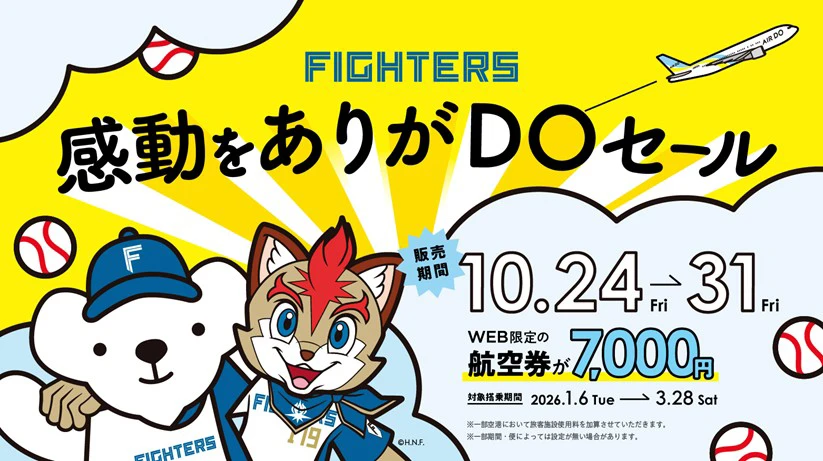 AIRDO(エア・ドゥ)では、「2025 パーソル クライマックスシリーズ パ」ならびに今シーズンの北海道日本ハムファイターズの激闘を称え、2025年10月24日(金)0:00よりセール運賃「DOセール」を販売。2026年1月6日(火)~3月28日(土)を対象搭乗日とし、全路線一律7,000円でセール運賃を設定。