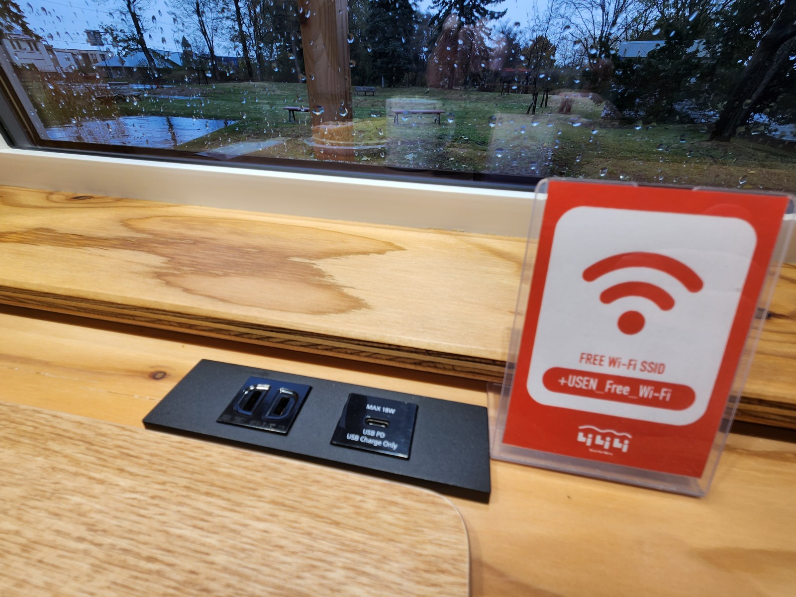 伺った日はあいにくの雨でしたが、大きな窓からは百合が原公園が見えます。天気が良い日は、季節ごとの景色を眺めながら過ごせる心地よい席です。カフェ内はWi-Fi完備、カウンター席には電源も設置しているので、ワークスペースとしても利用できます。