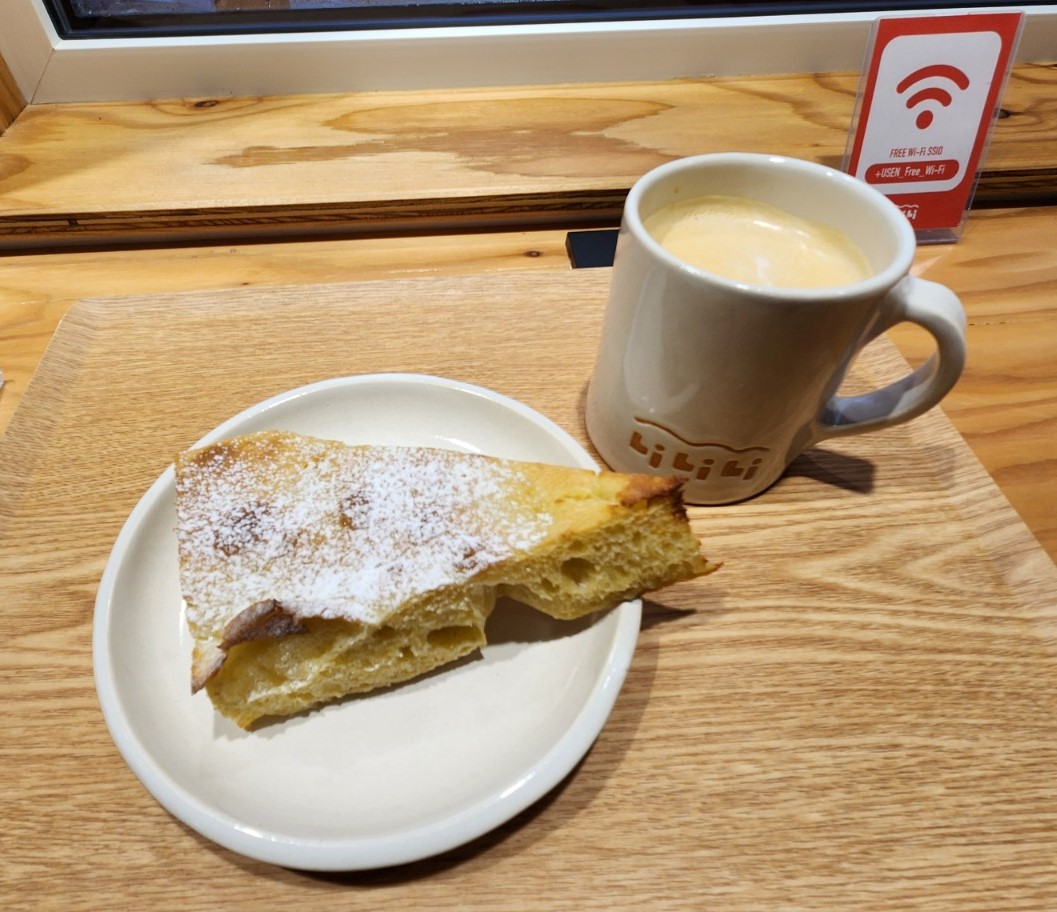 筆者は、フレンチトースト風フォカッチャとホットカフェオレを頼んで窓側の席を利用しました。ふわっとした生地で小麦の味が広がる甘いフォカッチャとカフェオレがベストマッチ。ホッと一息付けます。