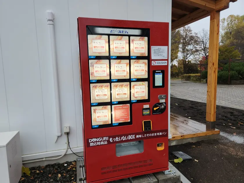 「LiLiLi」の外には、どんぐりのもったいないBOX冷凍パンの自販機も。この日はすべて売り切れだったのが残念。