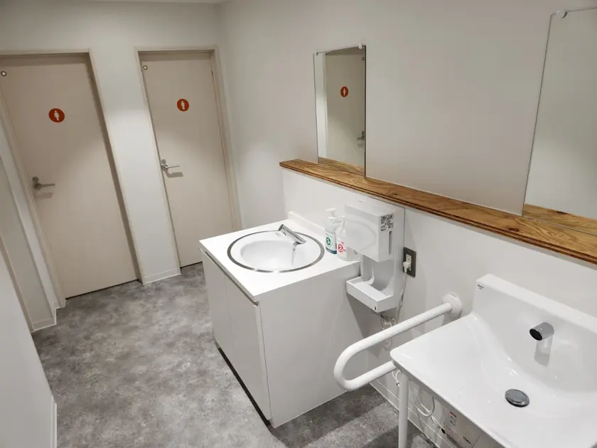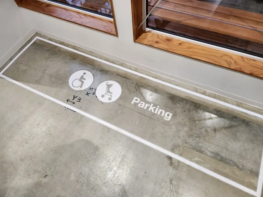 カフェはあまり広くないですが、入り口に車いすやベビーカーを置くスペースが確保されています。トイレにはおむつ替えスペースも完備されています。