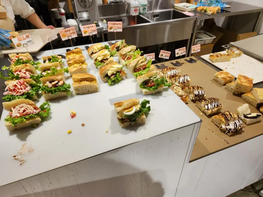 「どんぐり」と共同開発したオリジナルフォカッチャサンドは、ふわっと軽いフォカッチャに、野菜と具材がしっかり挟まったサンドのほかにスイーツ系など計10種。毎日10:00 / 11:30 / 13:30 / 15:30の4回、75個ずつ焼き上がる限定メニューで、人気のため、おひとり様3個までの個数制限がありました。