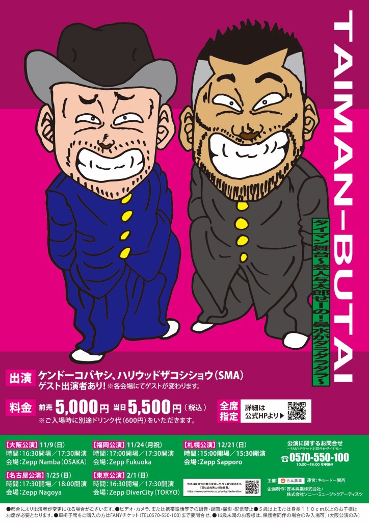 ケンドーコバヤシとハリウッドザコシショウのツーマンライブ『タイマン舞台〜芸人与太郎 せーの!鼻水がダラダラダラ〜』の全国ツアーが札幌でも開催!心斎橋筋2丁目劇場時代に誕生し、伝説となったライブ『タイマン舞台』。ケンドーコバヤシとハリウッドザコシショウが企画から構成まで全てを手掛けたこの舞台は、昨年一度限りの復活を果たしました。