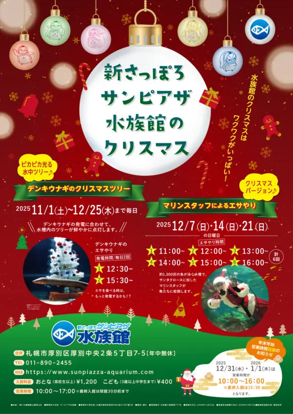 新さっぽろサンピアザ水族館で、毎年恒例のクリスマスイベントが12月25日まで開催中。館内ではデンキウナギの水槽にクリスマスツリーを設置し、ウナギが発電するタイミングに合わせてツリーが鮮やかに点灯するユニークな演出が楽しめます。また、約1,500匹の魚たちにサンタ姿のマリンスタッフが餌を与える特別パフォーマンスも日曜日限定で実施。