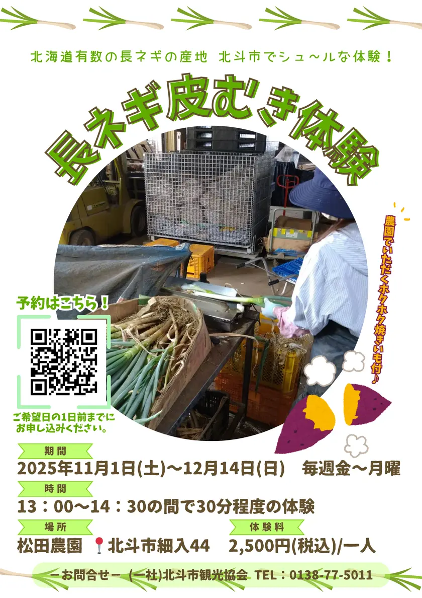 北海道北斗市で、地元産長ネギを専用機械で“シューッ”と皮むきするユニークな体験イベント。30分間の体験後は、会場の松田農園で収穫し追熟したさつまいもを焼きいもで味わえる特典付き!さらには隣接の直売所では旬の野菜も購入できます。12月14日までの期間、毎週金曜~月曜日の開催で、前日までの事前予約制になっています。