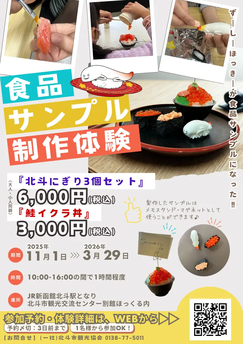 11月1日からスタートした「食品サンプル制作体験」では、お寿司や海鮮丼を北斗市ならではの、“あのお魚”と“あの人気者”が、とってもリアルに作れます!『北斗にぎり3個セット』(マグネット)、『鮭イクラ丼』(メモスタンド)の2種類から製作するものを選び制作。にぎり3個のうちのひとつはなんと北斗市の宣伝隊長「ずーしーほっきー」!ずーしーファンのみなさま必見の体験です!