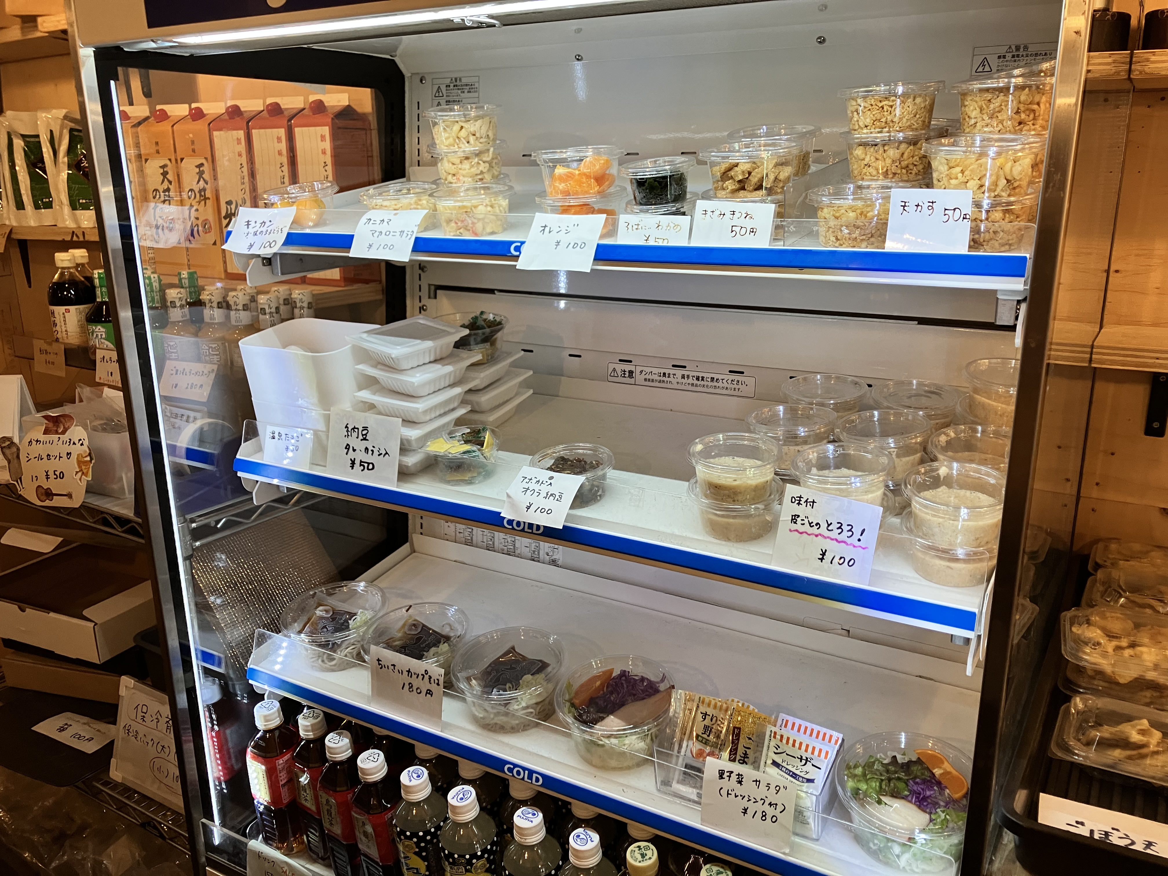 大きな冷蔵庫に並ぶ冷蔵品や、常温可で賞味期限が長いもの、油そばやつけ麺用の調味料などがドドーンと大量に並んでいます。冷蔵品で消費期限が迫っているものは、特価から更に割引されるなどお買い得な商品もありました。