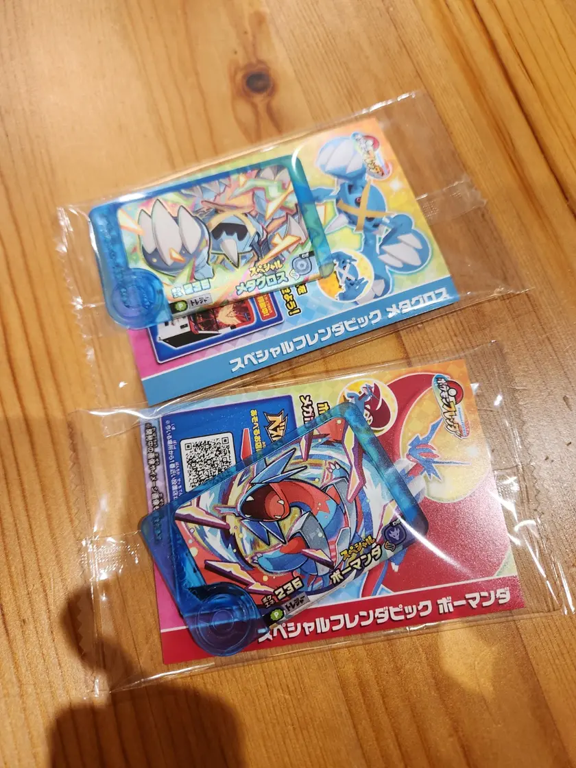 こちらがキャンペーン初日にゲットしたメガメタグロスとメガボーマンダのフレンダピック。透明なパッケージに入っているので、在庫があればお客さん側でどちらか選べるよう。