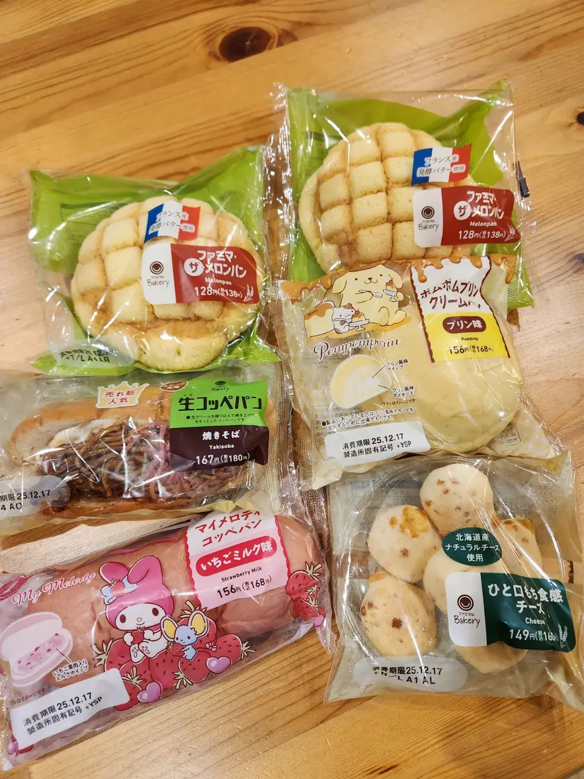 フレンダピックのために買ったパン6個。ちょうどサンリオコラボのパンが2種類出ていたのでそれそれ選び、メロンパンは2個チョイス。