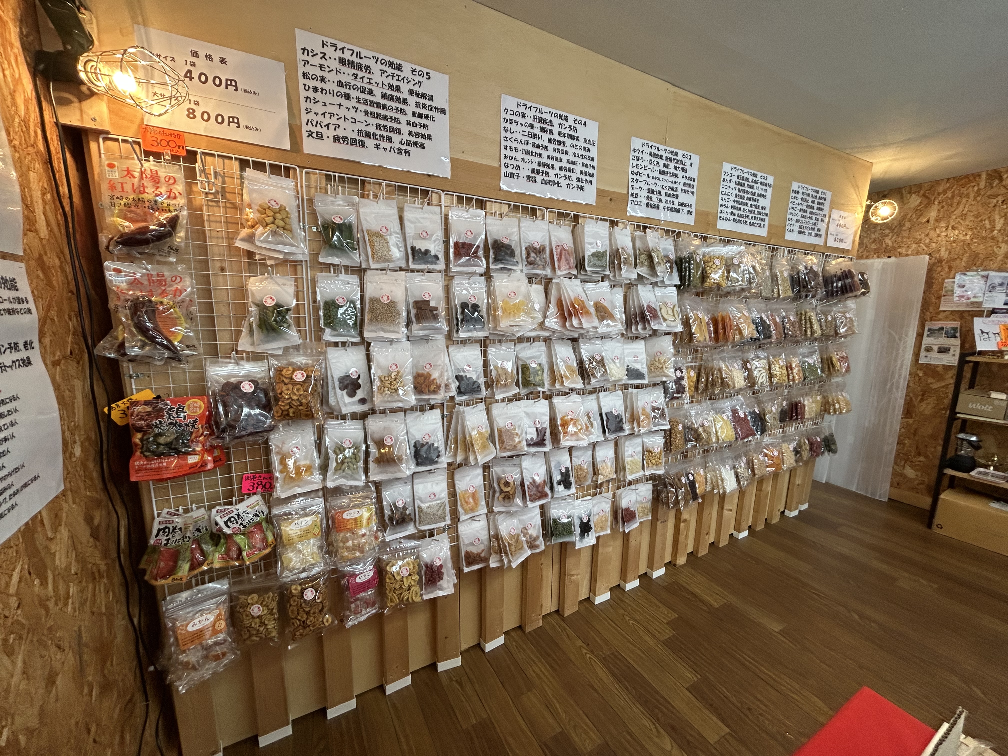 店舗に入ると正面の広い壁に美しく並べられたドライフルーツ。さすが専門店。