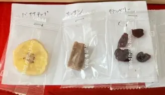 左から、バナナチップス・サンザシ・クランベリー。