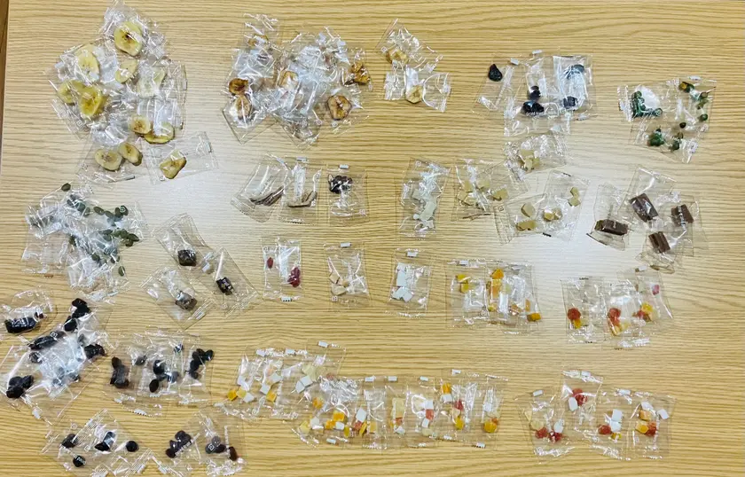 最初「これは何ですか?」など聞いて選んでいましたが、袋からはみ出し始めたら、それどころじゃない。薄いバナナ(バナナチップス)をいかに上手く挟み込むかが勝負とアドバイスを受けて実行してみるのですが、ビニール素材の個包装が滑って安定しない。