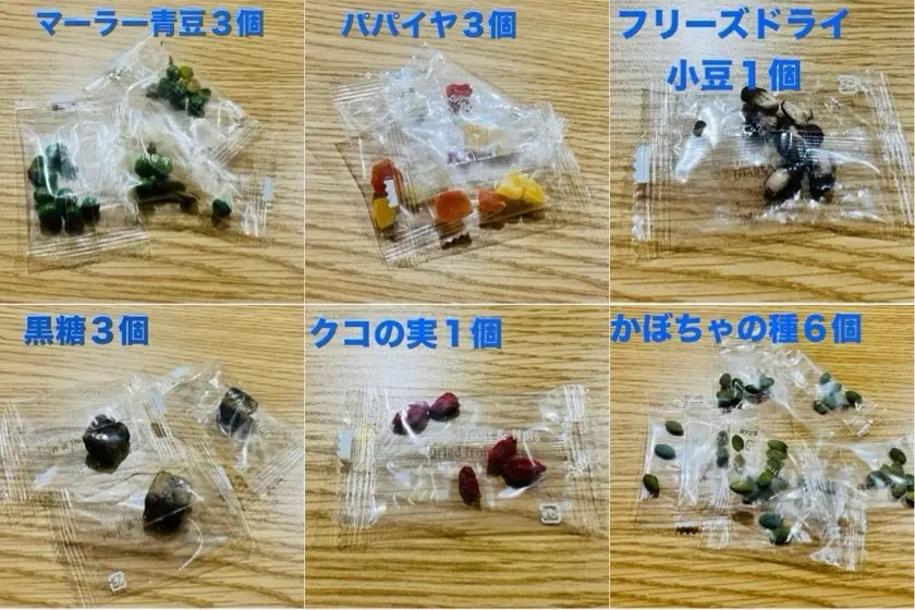 左から、マーラー青豆・パパイヤ・フリーズドライ小豆。