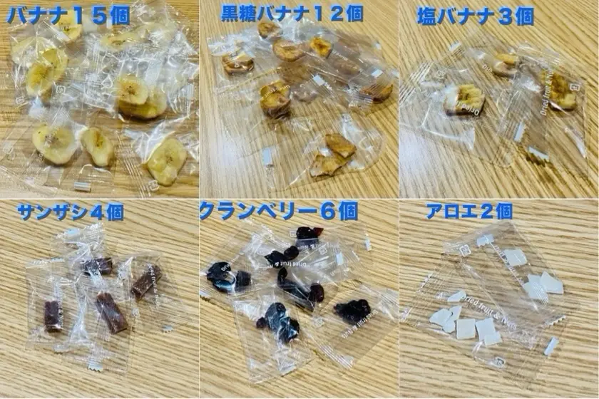左から、アロエ・塩バナナチップス・オーガニックレーズン・パイン。