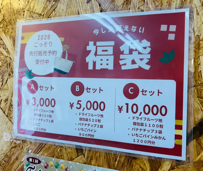 値段3パターンで、詰め放題と同じ個包装のドライフルーツがドカンと入ったダンボール箱の福袋(宝箱かな?)が発売中です。