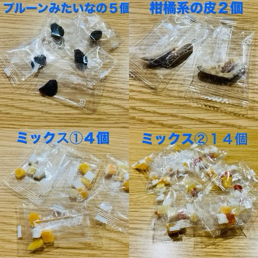 では、種類ごとの個数などを見ていただきます。フルーツの名前は忘れてしまったものもあり、かなり怪しいですがご勘弁を。