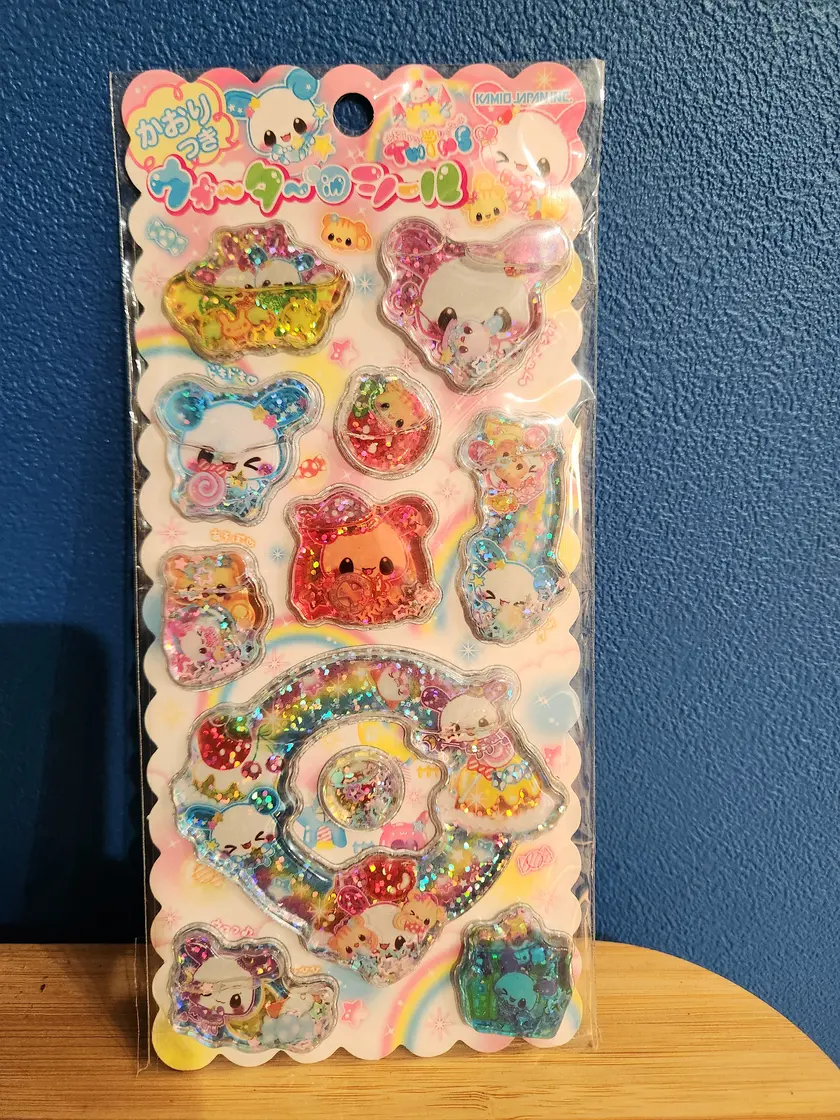 ボンボンドロップシールと同じく、透明感や立体感があり、シールの中に色つきの水、キャラクターの顔や星形が入っているので、振ると動く楽しさがある香り付きシールです。