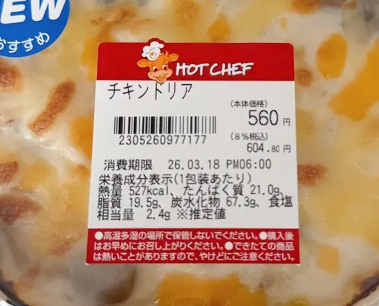 新商品のチキンドリアのお値段は本体価格 560円(8%税込 604.80円)。豊富町産牛乳を使っているのも魅力のひとつです。せっかくの店内調理品なので、やはり温かいうちに食べたい!!帰宅後すぐに実食しました。