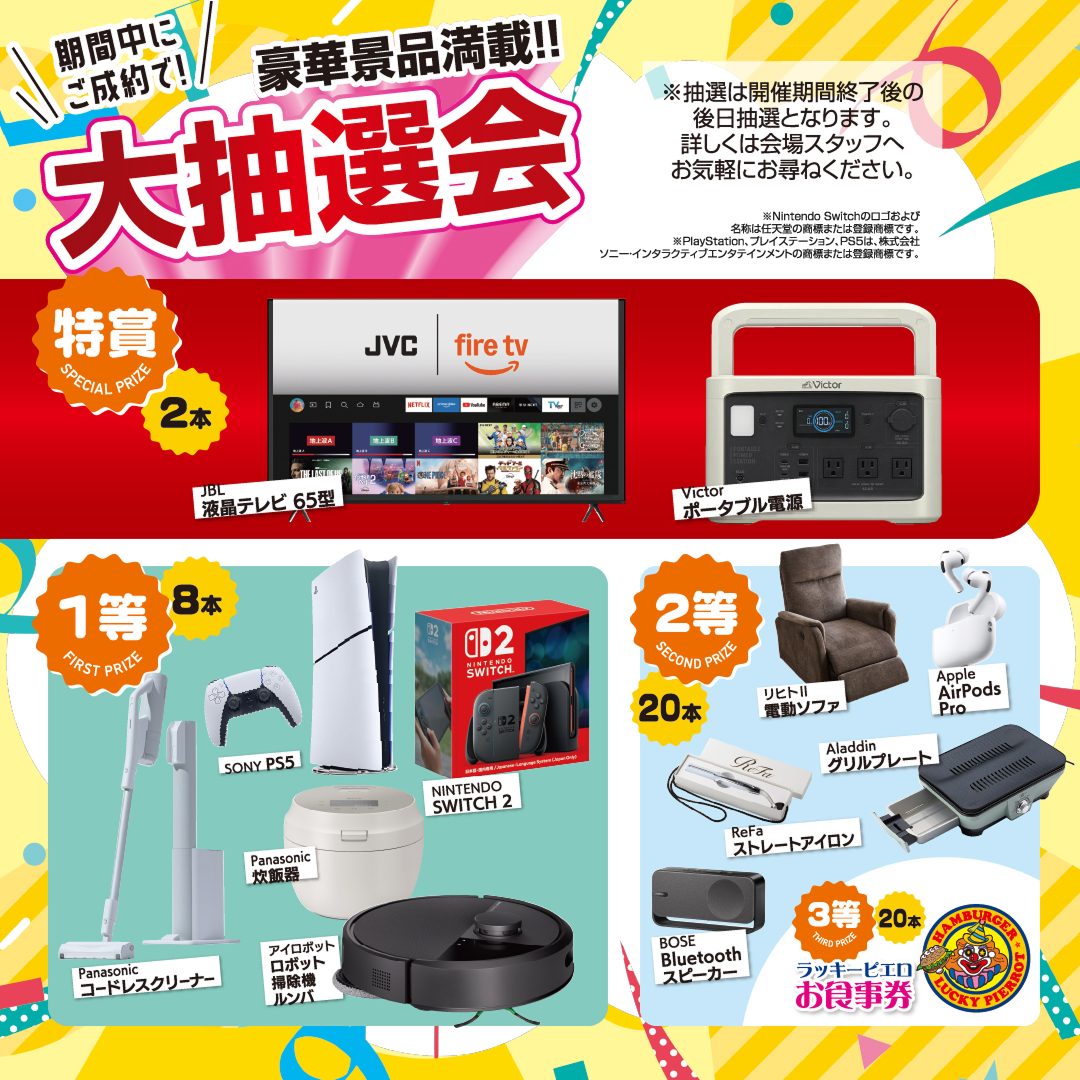 期間中のご成約で豪華景品が当たる大抽選会に参加できます!おでかけでも活用できる特賞のポータブル電源から、3等のラッキーピエロお食事券まで嬉しいプレゼント盛りだくさん!