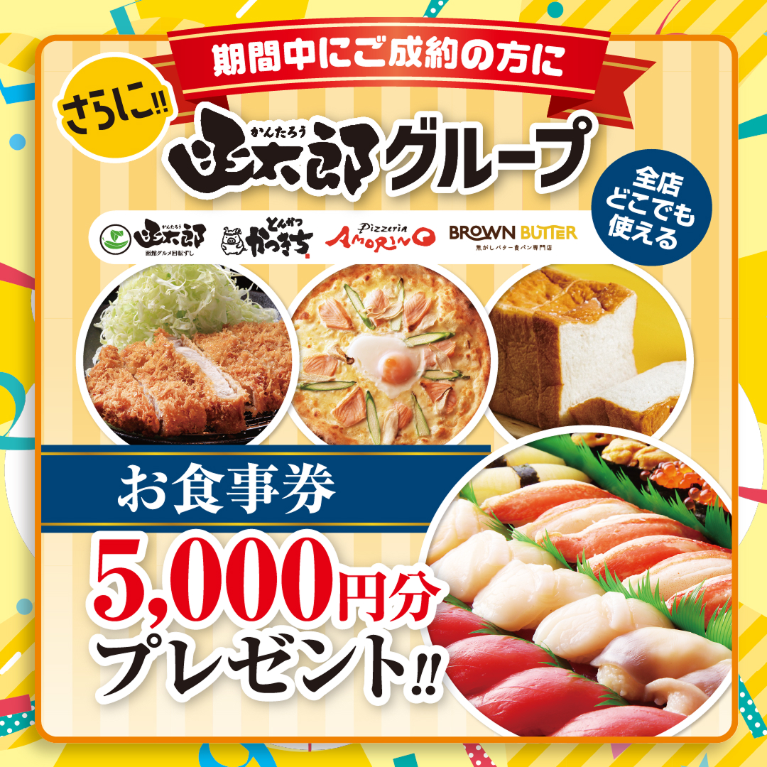 さらに期間中ご成約の方に、函太郎グループ(函館グルメ回転ずし 函太郎、とんかつ かつきち、Pizzeria AMORINO、ブラウンバター)の全店どこでも使えるお食事券5,000円分をプレゼント!