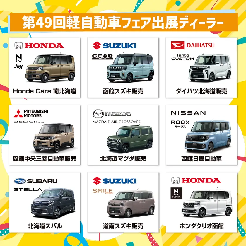 | 出展ディーラー | ホンダカーズ南北海道(株)、函館スズキ販売(株)、ダイハツ北海道販売(株)、函館中央三菱自動車販売(株)、北海道マツダ販売(株)、函館日産自動車(株)、北海道スバル(株)、道南スズキ販売(株)、(株)ホンダクリオ函館 |