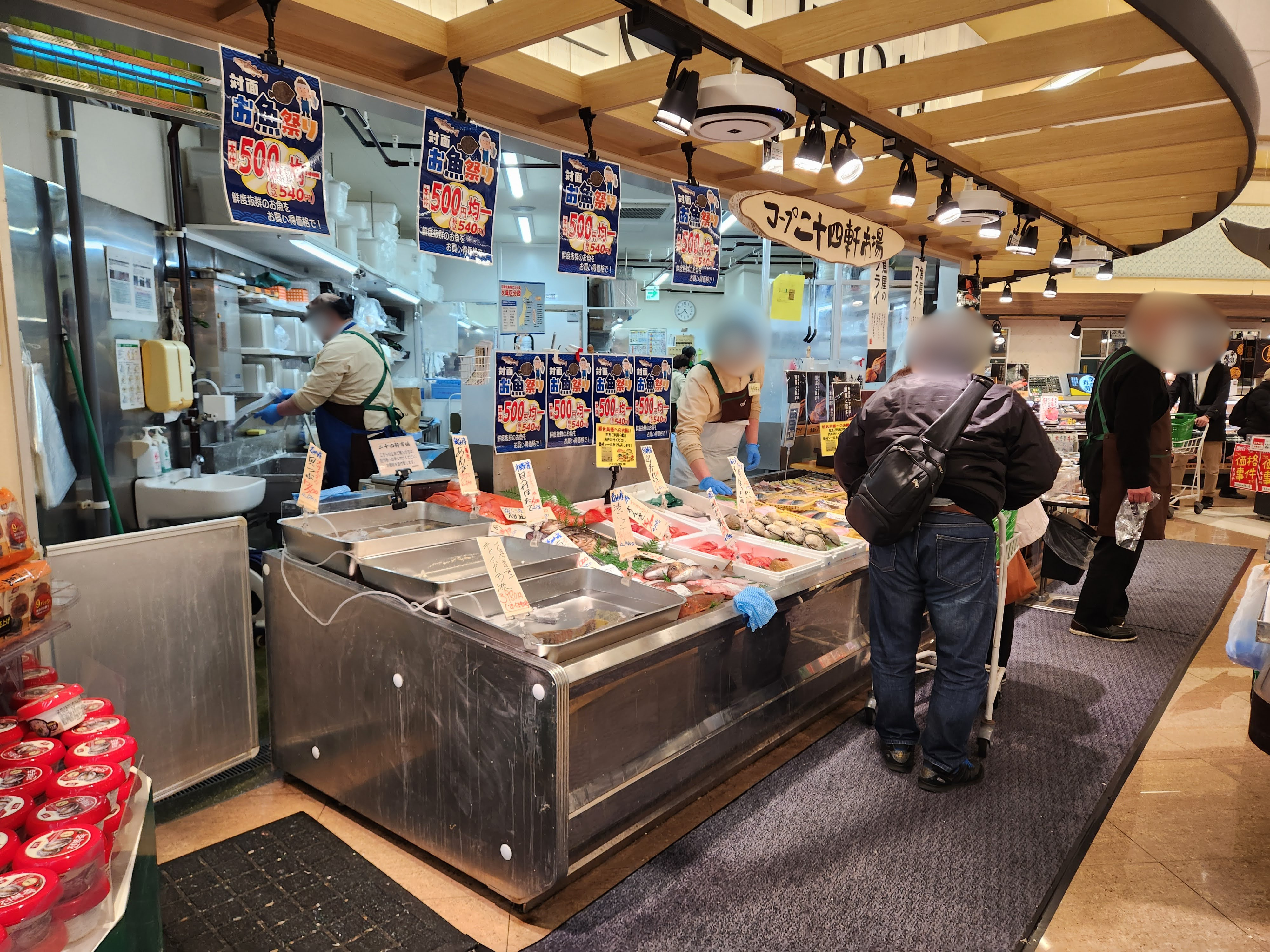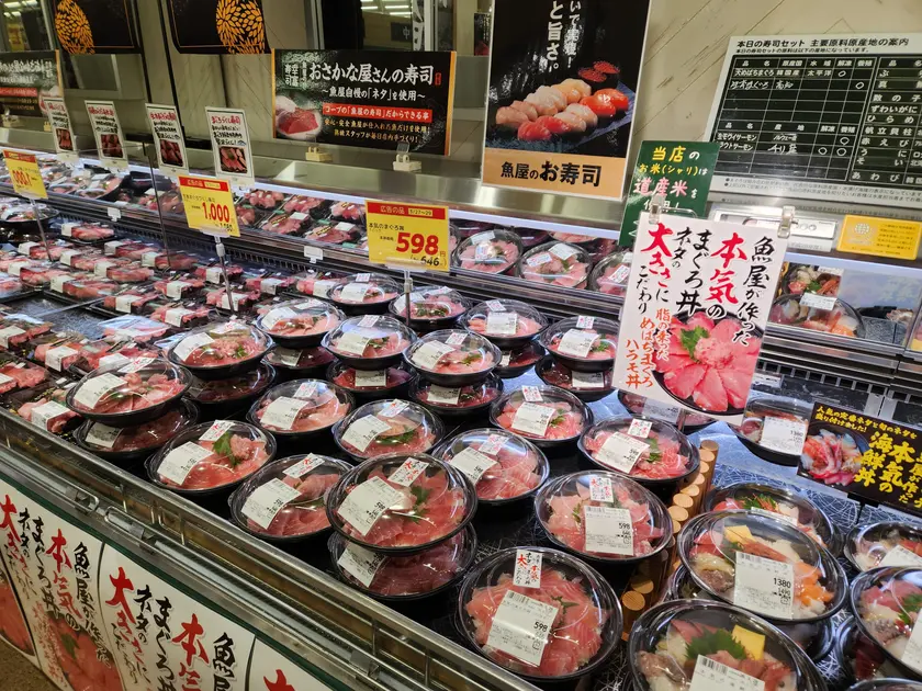 今回の二十四軒店は、生鮮の強化が大きな見どころです。公式発表では、青果・鮮魚・精肉・デリカを強化し、生鮮3部門は「八百屋・魚屋・肉屋」としての専門性を高めたとしています。鮮魚は対面販売を強化し、毎朝市場で仕入れた約30魚種を目指して販売。「魚屋のフライ」や「本気のマグロ丼」も展開し、精肉では希少部位のトモサンカクを使ったローストビーフ商品や、焼き肉売り場の強化も打ち出しています。